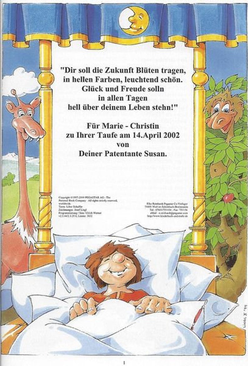 Personalisiertes Kinderbuch für 1 Kind. Der Name des Kindes spielt die Hauptrolle. Der Name des Kindes ist auf jeder Seite im laufenden Text enthalten. Dem Anlass entsprechend können Sie auf der 1.Seite eine persönliche Widmung angeben. Sprachen: deutsch französisch